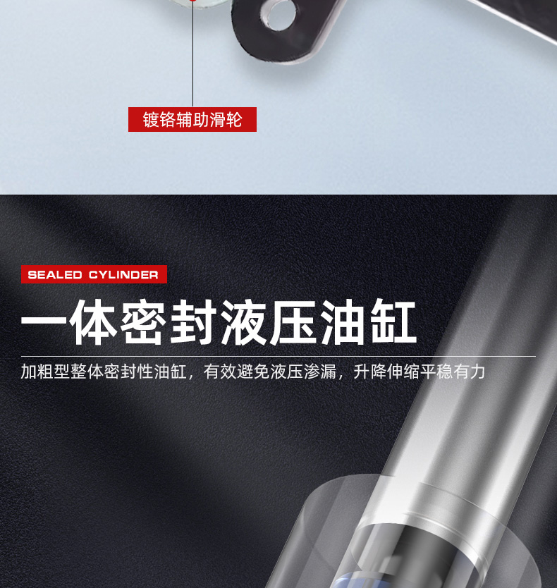 一体密封液压油缸加粗型,有效避免液压渗漏,升降伸缩平稳有力。